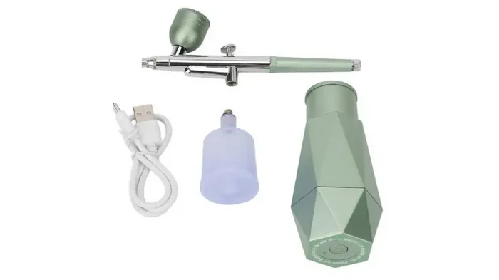 - Для нейл-дизайна: Double Action, сопло 0,2–0,3 мм, компактный компрессор с ресивером, верхний бачок на 2–5 мл.
