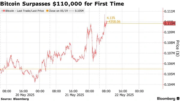 Криптовалюта Bitcoin демонстрирует невиданный темп роста в цене. Рынок разогрет интересом институций и ожиданием регулирования в США. Об этом сообщает Bloomberg. По данным издания, в четверг, 22 мая, во время утренних торгов в Азии, Bitcoin поднялся на 2,2% и достиг 110 707 долларов, после чего частично скорректировался. Рост цены криптовалюты частично связан с продвижением в Сенате США законопроекта по регулированию "стейблкоинов" (stablecoin), что, по мнению аналитиков, создает предпосылки для повышения правовой определенности на крипторынке. Кроме того, на динамику курса влияет высокий спрос со стороны компании Strategy Майкла Сейлора, которая уже аккумулировала Bitcoin на сумму более 50 млрд долларов, а также активность других крупных цифровых активов.