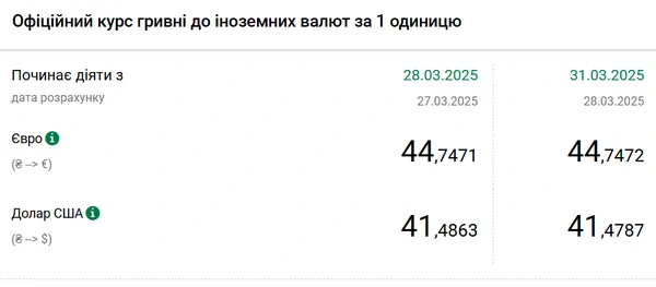 Национальный банк Украины (НБУ) снизил курс доллара к гривне на последний день марта. За месяц доллар подешевел на 4 копейки. Об этом сообщает РБК-Украина со ссылкой на данные на сайте регулятора. Официальный курс на 31 марта 2025 года установлен на таком уровне: 41,4787 гривен за 1 доллар (-0,0076 грн). Официальный курс евро составит 44,7472 гривен за 1 евро (+0,0001 грн).