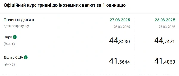 Национальный банк Украины (НБУ) снизил курс доллара к гривне. Доллар дешевеет второй день подряд. Об этом сообщает РБК-Украина со ссылкой на данные на сайте регулятора. Официальный курс на 28 марта 2025 года установлен на таком уровне: 41,4863 гривен за 1 доллар (-0,0781 грн). Официальный курс евро составит 44,7471 гривен за 1 евро (-0,0759 грн).