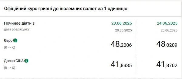 Национальный банк Украины (НБУ) повысил курс доллара к гривне. Доллар за четыре дня подрожал на 35 копеек. Об этом сообщает РБК-Украина со ссылкой на данные на сайте регулятора. Официальный курс на 24 июня 2025 года установлен на таком уровне: 41,8702 гривен за 1 доллар (+0,0367 грн). Официальный курс евро составит 48,0209 гривен за 1 евро (-0,1797 грн). Евро подешевел после максимума.