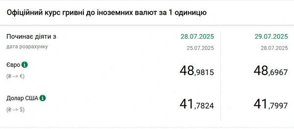Национальный банк Украины (НБУ) немного повысил курс доллара к гривне. Единая европейская валюта подешевела. Об этом сообщает РБК-Украина со ссылкой на данные на сайте регулятора. Официальный курс на 29 июля 2025 года установлен на таком уровне: 41,7997 гривен за 1 доллар (+0,0173 грн). Официальный курс евро составит 48,6967 гривен за 1 евро (-0,2848 грн).