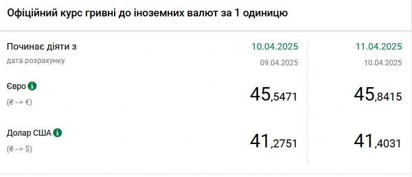 Национальный банк Украины (НБУ) повысил курс доллара к гривне. Единая европейская валюта подорожала еще на 30 копеек. Об этом сообщает РБК-Украина со ссылкой на данные на сайте регулятора. Официальный курс на 11 апреля 2025 года установлен на таком уровне: 41,4031 гривен за 1 доллар (+0,1280 грн). Официальный курс евро составит 45,8415 гривен за 1 евро (+0,2944 грн).