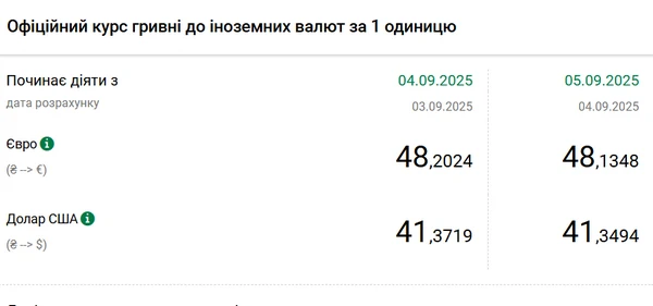 Национальный банк Украины (НБУ) снизил курс доллара к гривне. Единая европейская валюта также подешевела. Об этом сообщает РБК-Украина со ссылкой на данные на сайте регулятора. Официальный курс на 5 сентября 2025 года установлен на таком уровне: 41,3494 гривен за 1 доллар (-0,0225 грн). Официальный курс евро составит 48,1348 гривен за 1 евро (-0,0676 грн).