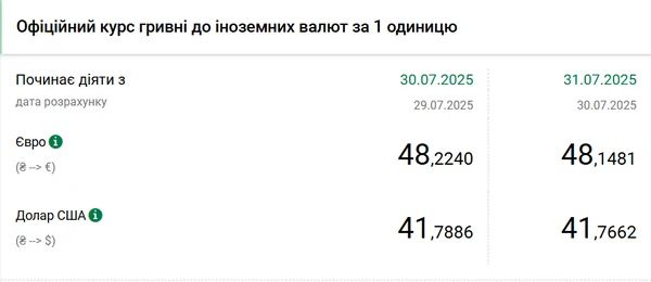 Национальный банк Украины (НБУ) немного снизил курс доллара к гривне. Единая европейская валюта также подешевела. Об этом сообщает РБК-Украина со ссылкой на данные на сайте регулятора. Официальный курс на 31 июля 2025 года установлен на таком уровне: 41,7662 гривен за 1 доллар (-0,0224 грн). За месяц курс вырос на 12 копеек. Официальный курс евро составит 48,1481 гривен за 1 евро (-0,0759 грн). За месяц курс упал на 64 копейки.