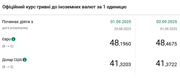 Национальный банк Украины (НБУ) повысил курс доллара к гривне. Единая европейская валюта также подорожала. Об этом сообщает РБК-Украина со ссылкой на данные на сайте регулятора. Официальный курс на 2 сентября 2025 года установлен на таком уровне: 41,3722 гривен за 1 доллар (+0,0519 грн). Официальный курс евро составит 48,4675 гривен за 1 евро (+0,2715 грн).