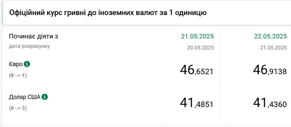 Национальный банк Украины (НБУ) снизил курс доллара к гривне. Доллар дешевеет второй день подряд. Об этом сообщает РБК-Украина со ссылкой на данные на сайте регулятора. Официальный курс на 22 мая 2025 года установлен на таком уровне: 41,436 гривен за 1 доллар (-0,0491 грн). Официальный курс евро составит 46,9138 гривен за 1 евро (+0,2617 грн).