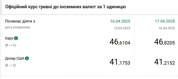 Национальный банк Украины (НБУ) повысил курс доллара к гривне. Единая европейская валюта также подорожала. Об этом сообщает РБК-Украина со ссылкой на данные на сайте регулятора. Официальный курс на 17 апреля 2025 года установлен на таком уровне: 41,2152 гривен за 1 доллар (+0,0399 грн). Официальный курс евро составит 46,8205 гривен за 1 евро (+0,2101 грн).