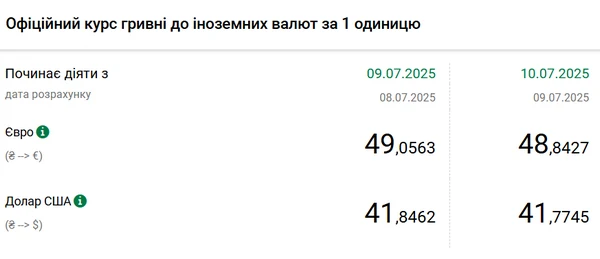 Национальный банк Украины (НБУ) снизил курс доллара к гривне. Единая европейская валюта упала ниже 49 гривен. Об этом сообщает РБК-Украина со ссылкой на данные на сайте регулятора. Официальный курс на 10 июля 2025 года установлен на таком уровне: 41,7745 гривен за 1 доллар (-0,0717 грн). Официальный курс евро составит 48,8427 гривен за 1 евро (-0,2136 грн).