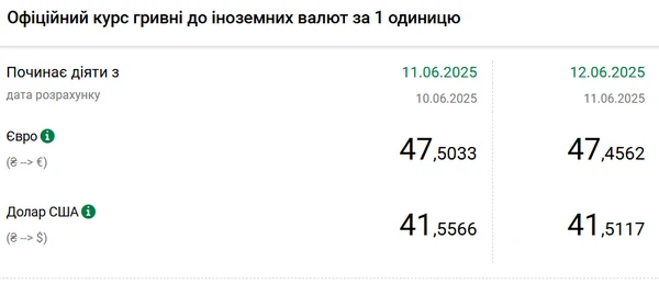 Национальный банк Украины (НБУ) снизил курс доллара к гривне. Доллар подешевел после роста два дня подряд. Об этом сообщает РБК-Украина со ссылкой на данные на сайте регулятора. Официальный курс на 12 июня 2025 года установлен на таком уровне: 41,5117 гривен за 1 доллар (-0,0449 грн). Официальный курс евро составит 47,4562 гривен за 1 евро (-0,0471 грн).