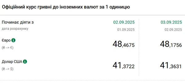 Национальный банк Украины (НБУ) снизил курс доллара к гривне. Единая европейская валюта также подешевела. Об этом сообщает РБК-Украина со ссылкой на данные на сайте регулятора. Официальный курс на 3 сентября 2025 года установлен на таком уровне: 41,3631 гривен за 1 доллар (-0,0091 грн). Официальный курс евро составит 48,1756 гривен за 1 евро (-0,2919 грн).