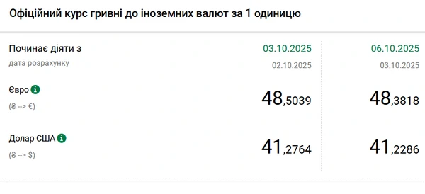 Национальный банк Украины (НБУ) снизил курс доллара к гривне. Доллар подешевел после двухдневного роста. Об этом сообщает РБК-Украина со ссылкой на данные на сайте регулятора. Официальный курс на 6 октября 2025 года установлен на таком уровне: 41,2286 гривен за 1 доллар (-0,0478 грн). Официальный курс евро составит 48,3818 гривен за 1 евро (-0,1221 грн).
