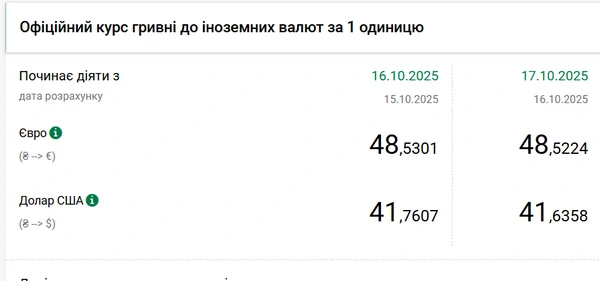 Национальный банк Украины (НБУ) снизил курс доллара к гривне. Доллар подешевел после шести дней роста. Об этом сообщает РБК-Украина со ссылкой на данные на сайте регулятора. Официальный курс на 17 октября 2025 года установлен на таком уровне: 41,6358 гривен за 1 доллар (+0,0093 грн). Официальный курс евро составит 48,5224 гривен за 1 евро (+0,2947 грн).