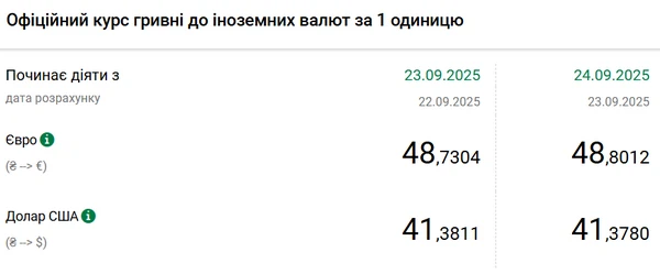 Национальный банк Украины (НБУ) снизил доллара к гривне. Доллар подешевел после роста четыре дня подряд. Об этом сообщает РБК-Украина со ссылкой на данные на сайте регулятора. Официальный курс на 24 сентября 2025 года установлен на таком уровне: 41,378 гривен за 1 доллар (-0,0031 грн). Официальный курс евро составит 48,8012 гривен за 1 евро (+0,0708 грн).