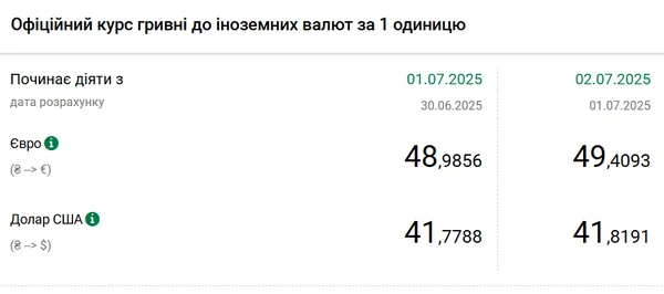 Национальный банк Украины (НБУ) повысил курс доллара к гривне. Курс евро в четвертый раз подряд обновил исторический максимум. Об этом сообщает РБК-Украина со ссылкой на данные на сайте регулятора. Официальный курс на 2 июля 2025 года установлен на таком уровне: 41,8191 гривен за 1 доллар (+0,0403 грн). Официальный курс евро составит 49,4093 гривен за 1 евро (+0,4237 грн). Предыдущий максимум был зафиксирован 1 июля - 48,9856.