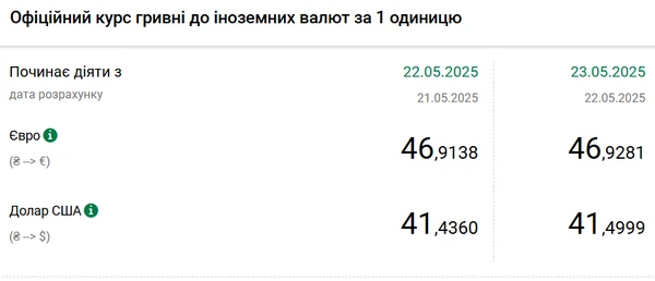 Национальный банк Украины (НБУ) повысил курс доллара к гривне. Доллар подорожал после двух дней снижения. Об этом сообщает РБК-Украина со ссылкой на данные на сайте регулятора. Официальный курс на 23 мая 2025 года установлен на таком уровне: 41,4999 гривен за 1 доллар (+0,0639 грн). Официальный курс евро составит 46,9281 гривен за 1 евро (+0,0143 грн).