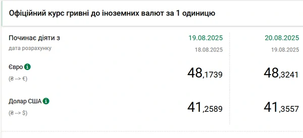 Национальный банк Украины (НБУ) повысил курс доллара к гривне. Доллар подорожал после падения до минимума с начала апреля. Об этом сообщает РБК-Украина со ссылкой на данные на сайте регулятора. Официальный курс на 20 августа 2025 года установлен на таком уровне: 41,3557 гривен за 1 доллар (+0,0968 грн). Официальный курс евро составит 48,3241 гривен за 1 евро (+0,1502 грн).