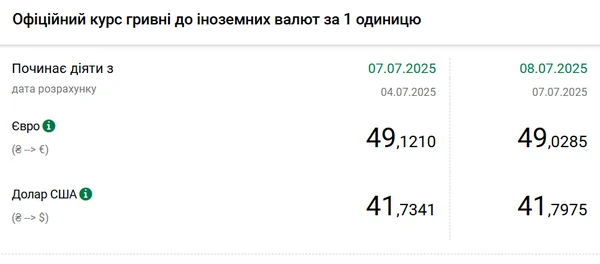 Национальный банк Украины (НБУ) повысил курс доллара к гривне. Единая европейская валюта подешевела, но стоит дороже 49 гривен. Об этом сообщает РБК-Украина со ссылкой на данные на сайте регулятора. Официальный курс на 8 июля 2025 года установлен на таком уровне: 41,7975 гривен за 1 доллар (+0,0634 грн). Официальный курс евро составит 49,0285 гривен за 1 евро (-0,0925 грн).