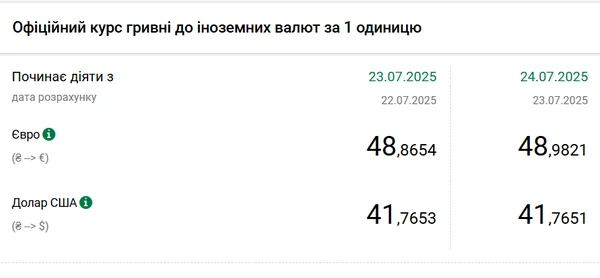 Национальный банк Украины (НБУ) немного снизил курс доллара к гривне. Единая европейская валюта подорожала. Об этом сообщает РБК-Украина со ссылкой на данные на сайте регулятора. Официальный курс на 24 июля 2025 года установлен на таком уровне: 41,7651 гривен за 1 доллар (-0,0002 грн). Официальный курс евро составит 48,9821 гривен за 1 евро (+0,1167 грн).