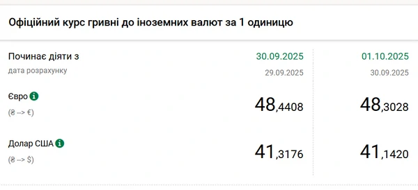 Национальный банк Украины (НБУ) снизил курс доллара к гривне. Доллар дешевеет третий день подряд. Об этом сообщает РБК-Украина со ссылкой на данные на сайте регулятора. Официальный курс на 1 октября 2025 года установлен на таком уровне: 41,142 гривен за 1 доллар (-0,1756 грн). Ниже курс был 10 сентября - 41,1237 грн/доллар. Официальный курс евро составит 48,3028 гривен за 1 евро (-0,1380 грн).