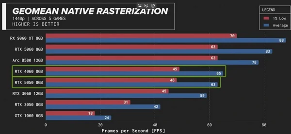 Один из самых известных технических YouTube-каналов, Linus Tech Tips, опубликовал обзор видеокарты GeForce RTX 5050. Модель стала самым доступным решением в серии RTX 5000 и ориентирована на геймеров с ограниченным бюджетом. В тестах видеокарта не произвела впечатления. В играх при разрешении 1080p GeForce RTX 5050 демонстрирует средние результаты: в некоторых проектах она догоняет GeForce RTX 4060, а в других уступает даже старой GeForce RTX 3060 с 12 ГБ видеопамяти. Особенно грустно выглядит ситуация в играх, требующих большого объема VRAM. При 1440p-гейминге ситуация усугубляется – карточка не справляется с большинством современных хитов и уступает недорогим моделям прошлых поколений.