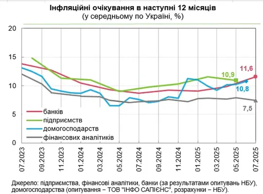 Инфляция в Украине несколько замедлилась по сравнению с пиковым значением в мае. Банкиры, бизнесмены и население не верят, что она упадет ниже 10%. Об этом сообщает РБК-Украина со ссылкой на данные на сайте НБУ. Банкиры в июле ухудшили инфляционные ожидания до 11,6%. В апреле они прогнозировали рост цен на уровне 9,8% в течение ближайших 12 месяцев. Инфляционные ожидания населения ухудшились в июне до 10,8% по сравнению с 10,2% в мае. Однако финансовые аналитики в июле улучшили прогноз до 7,5% по сравнению с 7,9% в мае 2025 года. Руководители предприятий в мае прогнозировали инфляцию на уровне 10,9% (прогноз за февраль 11,5%). Прогнозы по инфляцииПо данным Госстата, в июне 2025 года инфляция в Украине замедлилась до 14,3% в годовом измерении по сравнению с 15,9% в мае. Основной причиной стал статистический эффект. В июне 2024 года правительство повысило тарифы на электроэнергию для населения на 64%, а в этом году до осени цены меняться не будут.