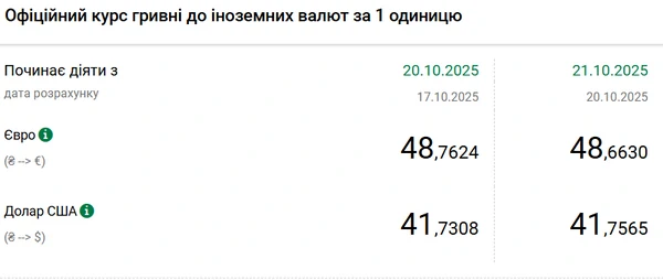 Национальный банк Украины (НБУ) повысил курс доллара к гривне. Доллар дорожает второй день подряд. Об этом сообщает РБК-Украина со ссылкой на данные на сайте регулятора. Официальный курс на 21 октября 2025 года установлен на таком уровне: 41,7565 гривен за 1 доллар (+0,0257 грн). Официальный курс евро составит 48,663 гривен за 1 евро (-0,0994 грн).