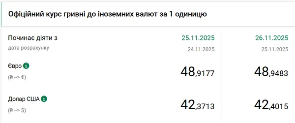 Национальный банк Украины (НБУ) вновь поднял официальный курс доллара. Американская валюта подорожала еще на 3 копейки и второй день подряд обновила свой исторический максимум по отношению к гривне. Об этом сообщает РБК-Украина со ссылкой на данные на сайте регулятора. Официальный курс доллара на 26 ноября 2025 года установлен на уровне 42,4015 гривны. Это новый исторический максимум стоимости американской валюты по отношению к гривне. Предыдущий рекорд был зафиксирован днем ранее – 25 ноября, когда курс достиг 42,37 гривны. С начала года доллар подорожал на 38 копеек: 1 января его стоимость составляла 42,02 гривны. С начала ноября рост составил 43 копейки, ведь в первый день месяца официальный курс был на уровне 41,97 гривны за доллар. Официальный курс евро на 26 ноября составляет 48,9483 гривны. Европейская валюта также укрепилась: по сравнению с показателем на 25 ноября ее цена также выросла на 3 копейки.