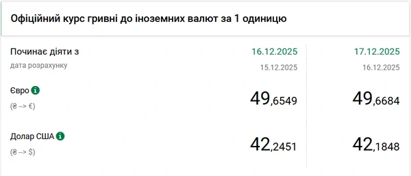 Официальный курс евро продолжает достигать новых рекордных значений, на 17 декабря НБУ установил стоимость европейской валюты на уровне 49,6684 гривен (на 1 копейку выше 16 декабря). Об этом сообщает РБК-Украина со ссылкой на данные на сайте регулятора. Официальный курс доллара на 17 декабря 2025 года установлен на таком уровне: 42,1848 гривен за 1 доллар (-0,06 грн).