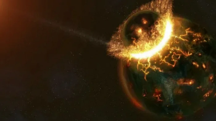 ![]() Фото: space.com Гигантский каменистый объект под названием Тейя врезался в нашу планету и это привело к созданию Луны