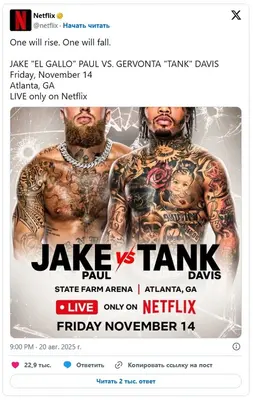 Боксирующий блогер Джейк Пол (12-1, 7 КО) и чемпион мира в легком весе по версии WBA Джервонта Дэвис (30-0-1, 28 КО) сформировали единое мнение по поводу боя между собой. Воплощением их желаний станет выставочный бой, о котором договорились боксеры. Бой запланирован на 14 ноября. Он состоится на State Farm Arena в американском городе Атланта. В прямом эфире поединок будет транслироваться ресурсами Netflix. | |