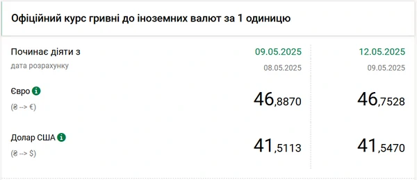Национальный банк Украины (НБУ) снова немного повысил курс доллара к гривне. Доллар начал дорожать с 9 мая. Об этом сообщает РБК-Украина со ссылкой на данные на сайте регулятора. Официальный курс на 12 мая 2025 года установлен на таком уровне: 41,547 гривен за 1 доллар (+0,0357 грн). Официальный курс евро составит 46,7528 гривен за 1 евро (-0,1342 грн).