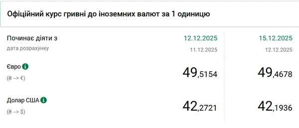 Национальный банк Украины (НБУ) снизил курс евро к гривне - на 5 копеек. Об этом сообщает РБК-Украина со ссылкой на данные на сайте регулятора. Официальный курс евро составляет 49,4678 гривен за 1 евро (-0,05 грн). Снижение произошло после того, как НБУ на 12 декабря установил рекордное значение курса евро на уровне 49,52 гривны. Официальный курс доллара на 15 декабря 2025 года установлен на таком уровне: 42,1936 гривен за 1 доллар (-0,08 грн).