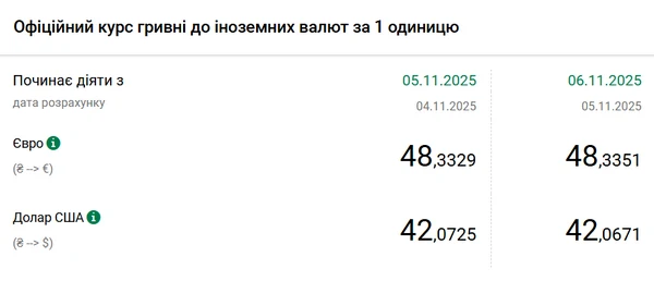 Национальный банк Украины (НБУ) понизил курс доллара к гривне – на 1 копейку. Об этом сообщает РБК-Украина со ссылкой на данные на сайте регулятора. Официальный курс доллара на 6 ноября 2025 года установлен на таком уровне: 42,0671 гривны за 1 доллар (-0,01 грн). НБУ понизил курс доллара после того, как повышал стоимость американской валюты три дня подряд. С начала года курс года курс доллара повысился на 4 копейки. 1 января 2025 года американская валюта стоила 42,02 гривны. При этом с 1 октября доллар вырос на 92 копейки. В начале месяца его стоимость составляла 41,14 гривны. Официальный курс евро на 6 ноября составляет 48,3351 гривны. Стоимость единой европейской валюты практически не изменилась относительно 5 ноября.