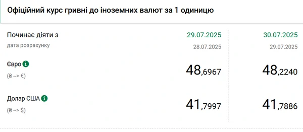 Национальный банк Украины (НБУ) немного снизил курс доллара к гривне. Единая европейская валюта резко подешевела. Об этом сообщает РБК-Украина со ссылкой на данные на сайте регулятора. Официальный курс на 30 июля 2025 года установлен на таком уровне: 41,7886 гривен за 1 доллар (-0,0111 грн). Официальный курс евро составит 48,2240 гривен за 1 евро (-0,4727 грн).