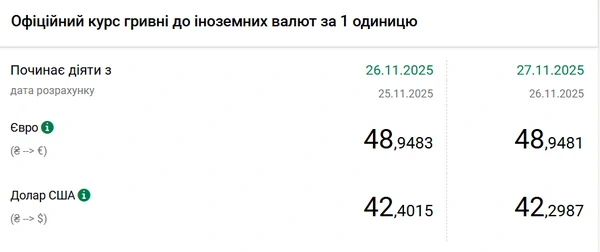 Национальный банк Украины (НБУ) понизил официальный курс доллара. Американская валюта подешевела на 11 копеек после того как два дня подряд обновляла свой исторический максимум по отношению к гривне. Об этом сообщает РБК-Украина со ссылкой на данные на сайте регулятора. Официальный курс доллара на 27 ноября 2025 года установлен на уровне 42,2987 гривны. 26 ноября валюта США находиться на историческом максимуме по отношению к гривне – 42,4015 гривны. Предыдущий рекорд был зафиксирован днем ранее – 25 ноября, когда курс доллара поднялся до 42,37 гривны. С начала года доллар прибавил в цене 27 копеек: 1 января его курс составлял 42,02 гривны. С начала ноября повышение достигло 32 копеек – в первый день месяца Национальный банк устанавливал доллар на уровне 41,97 гривны. Официальный курс евро на 27 ноября зафиксирован на отметке 48,9481 гривны. Стоимость европейской валюты почти не изменилась и остается близкой к показателю предыдущего дня.
