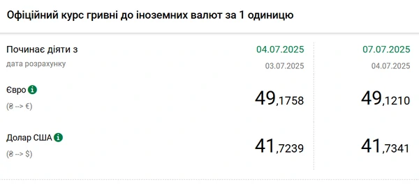 Национальный банк Украины (НБУ) повысил курс доллара к гривне. Единая европейская валюта подешевела, но стоит дороже 49 гривен. Об этом сообщает РБК-Украина со ссылкой на данные на сайте регулятора. Официальный курс на 7 июля 2025 года установлен на таком уровне: 41,7341 гривен за 1 доллар (+0,0102 грн). Официальный курс евро составит 49,121 гривен за 1 евро (-0,0548 грн).