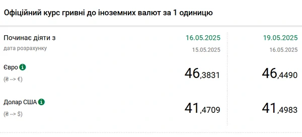 Национальный банк Украины (НБУ) повысил курс доллара к гривне. Единая европейская валюта подешевела. Об этом сообщает РБК-Украина со ссылкой на данные на сайте регулятора. Официальный курс на 19 мая 2025 года установлен на таком уровне: 41,4983 гривен за 1 доллар (+0,0274 грн). Официальный курс евро составит 46,449 гривен за 1 евро (+0,0659 грн).