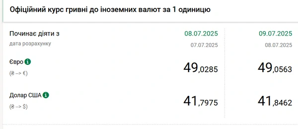 Национальный банк Украины (НБУ) повысил курс доллара к гривне. Единая европейская валюта стоит дороже 49 гривен. Об этом сообщает РБК-Украина со ссылкой на данные на сайте регулятора. Официальный курс на 9 июля 2025 года установлен на таком уровне: 41,8462 гривен за 1 доллар (+0,0487 грн). Официальный курс евро составит 49,0563 гривен за 1 евро (+0,0278 грн).