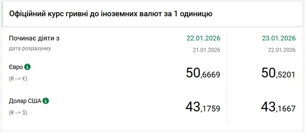Национальный банк второй день подряд продолжает снижать официальный курс евро и на 23 января он установлен на уровне — 50,52 гривен. Об этом сообщает РБК-Украина со ссылкой на данные на сайте регулятора. Официальный курс евро на 23 января составил 50,5201 гривен, что на 15 копеек ниже значения 22 января. С 1 января (49,79 гривен) курс евро вырос на 73 копейки. Курс доллара на 23 января установлен на уровне 43,1667 гривен (-0,01 гривен к предыдущему дню). Изменение котировок с начала годаС 1 января официальный курс евро вырос на 82 копейки, а доллара — на 73 копейки. За период 1-21 января курсы покупки-продажи доллара в обменниках и кассах банков снизились на 3-8 копеек — до 42,92-43,47 гривен. При этом, стоимость евро на наличном рынке выросла 86-91 копейку — до 50,30-50,96 гривен. Межбанк на этой неделеКурсы покупки-продажи евро на этой недели (за период 19-21 января) выросли на 4-7 копеек — до 50,43-50,48 гривен, а курсы доллара снизились на 25-27 копеек — до 43,01-43,06 гривен (покупка-продажа). | |