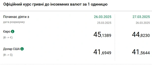 Национальный банк Украины (НБУ) снизил курс доллара к гривне. Доллар подешевел после двухдневного роста. Об этом сообщает РБК-Украина со ссылкой на данные на сайте регулятора. Официальный курс на 27 марта 2025 года установлен на таком уровне: 41,5644 гривен за 1 доллар (-0,1305грн). Официальный курс евро составит 44,823 гривен за 1 евро (-0,3159 грн).