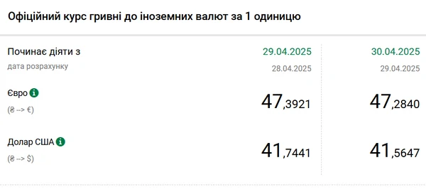 Национальный банк Украины (НБУ) снизил курс доллара к гривне на последний день апреля. В итоге за месяц курс вырос всего на 9 копеек. Об этом сообщает РБК-Украина со ссылкой на данные на сайте регулятора. Официальный курс на 30 апреля 2025 года установлен на таком уровне: 41,5647 гривен за 1 доллар (-0,1794 грн). Официальный курс евро составит 47,284 гривен за 1 евро (-0,1081 грн).