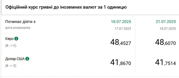 Национальный банк Украины (НБУ) снизил курс доллара к гривне. Единая европейская валюта подорожала. Об этом сообщает РБК-Украина со ссылкой на данные на сайте регулятора. Официальный курс на 21 июля 2025 года установлен на таком уровне: 41,7514 гривен за 1 доллар (-0,1156 грн). Официальный курс евро составит 48,607 гривен за 1 евро (+0,1543 грн).