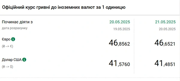 Национальный банк Украины (НБУ) снизил курс доллара к гривне. Единая европейская валюта также подешевела. Об этом сообщает РБК-Украина со ссылкой на данные на сайте регулятора. Официальный курс на 21 мая 2025 года установлен на таком уровне: 41,4851 гривен за 1 доллар (-0,0909 грн). Официальный курс евро составит 46,6521 гривен за 1 евро (-0,2041 грн).