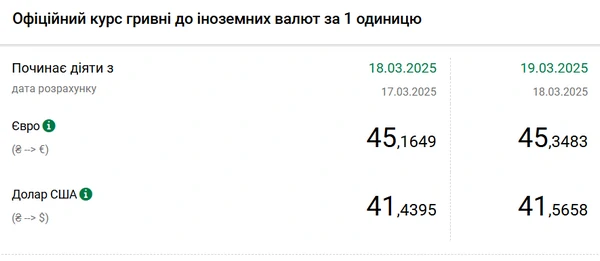 Национальный банк Украины (НБУ) повысил курс доллара к гривне. Доллар подорожал после двух дней падения. Об этом сообщает РБК-Украина со ссылкой на данные на сайте регулятора. Официальный курс на 19 марта 2025 года установлен на таком уровне: 41,5658 гривен за 1 доллар (+0,1263 грн). Официальный курс евро составит 45,3483 гривен за 1 евро (+0,1834 грн).