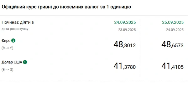 Национальный банк Украины (НБУ) повысил курс доллара к гривне. Доллар подорожал после снижения накануне. Об этом сообщает РБК-Украина со ссылкой на данные на сайте регулятора. Официальный курс на 25 сентября 2025 года установлен на таком уровне: 41,4105 гривен за 1 доллар (+0,0325 грн). Официальный курс евро составит 48,6573 гривен за 1 евро (-0,1439 грн).