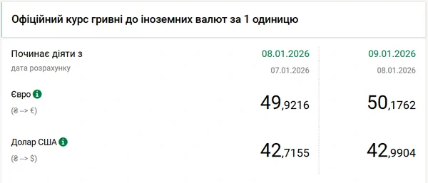 Национальный банк повысил официальный курс доллара на 9 января на 27 копеек — до 42,99 гривен, а курс евро на 25 копеек — до 50,18 гривен, эти значения являются рекордными для украинского валютного рынка. Об этом сообщает РБК-Украина со ссылкой на данные на сайте регулятора. Официальный курс доллара на 9 января установлен на уровне 42,9904 гривен, а евро — 50,1762 гривен. Официальный курс доллара c 1 января 2026 года вырос на 64 копеек, а курс евро — на 39 копеек. Средние курсы покупки доллара и евро на наличном рынке составляют 42,66 гривен (+0,21 гривна) и 49,88 гривен (0,19 гривен). На межбанке в результате торгов 7 января курс доллара находился на уровне 42,91-42,94 гривны за доллар (покупка-продажа), что на 34 копеек выше закрытия торговой сессии 6 января. Курс евро на межбанке составил 50,20-50,22 гривен (курс покупки был выше на 34 копеек по сравнению со значениями предыдущего дня). | |