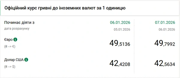 Официальный курс доллара на 7 января был установлен НБУ на рекордном значении — 42,56 гривен, что на 14 копеек больше курса 6 января. Об этом сообщает РБК-Украина со ссылкой на данные мониторинга рынка. С 1 октября 2025 года официальный курс вырос на 1,42 гривен. Официальный курс евро составляет 49,80 гривен за 1 евро (+0,29 грн).