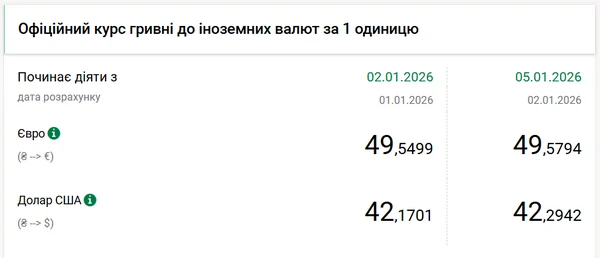 Национальный банк Украины (НБУ) повысил курс доллара к гривне — на 12 копеек. Об этом сообщает РБК-Украина со ссылкой на данные на сайте регулятора. Официальный курс доллара на 5 января 2026 года установлен на таком уровне: 42,2942 гривен за 1 доллар (+0,12 грн). Официальный курс евро составляет 49,5794 гривен за 1 евро (+0,03 грн).