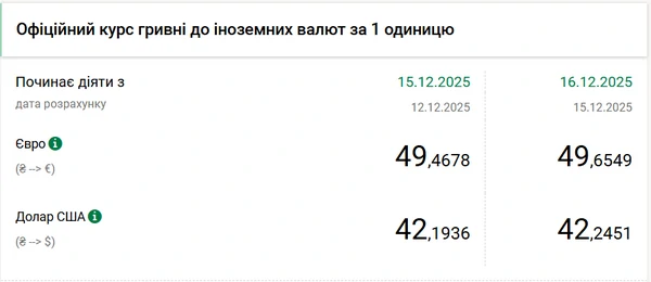 Курс евро НБУ на 16 декабря установил на рекордном уровне 49,65 гривен, что на 19 копеек выше значения 15 декабря и предыдущего рекордного значения (49,51 гривен). Об этом сообщает РБК-Украина со ссылкой на данные на сайте регулятора. Официальный курс евро на 16 декабря составляет 49,6549 гривен за 1 евро (+0,19 грн). Официальный курс доллара на 16 декабря 2025 года установлен на таком уровне: 42,2451 гривен за 1 доллар (+0,05 грн).